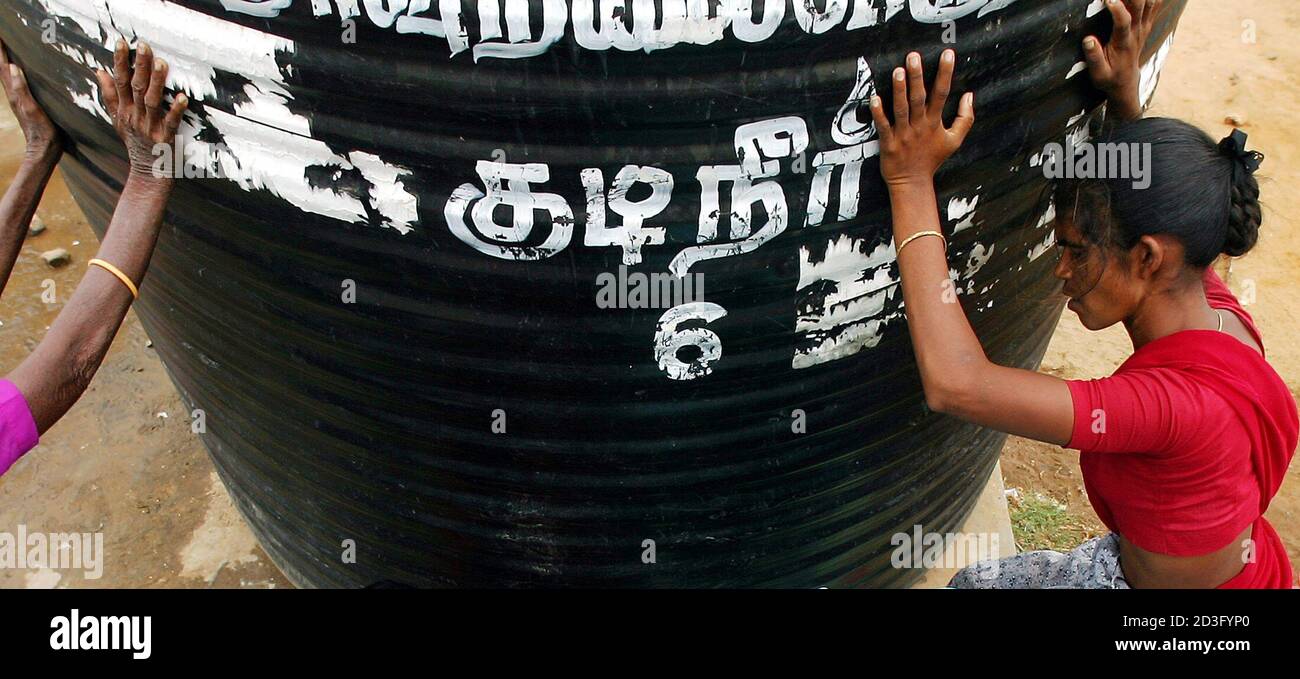 A Woman Who Survived Last Year S Tsunami Tilts An Almost Empty Water Tank To Pour Out The Remaining Water In The Southern Indian Village Of Tharangampadi June 21 2005 Almost Six Months